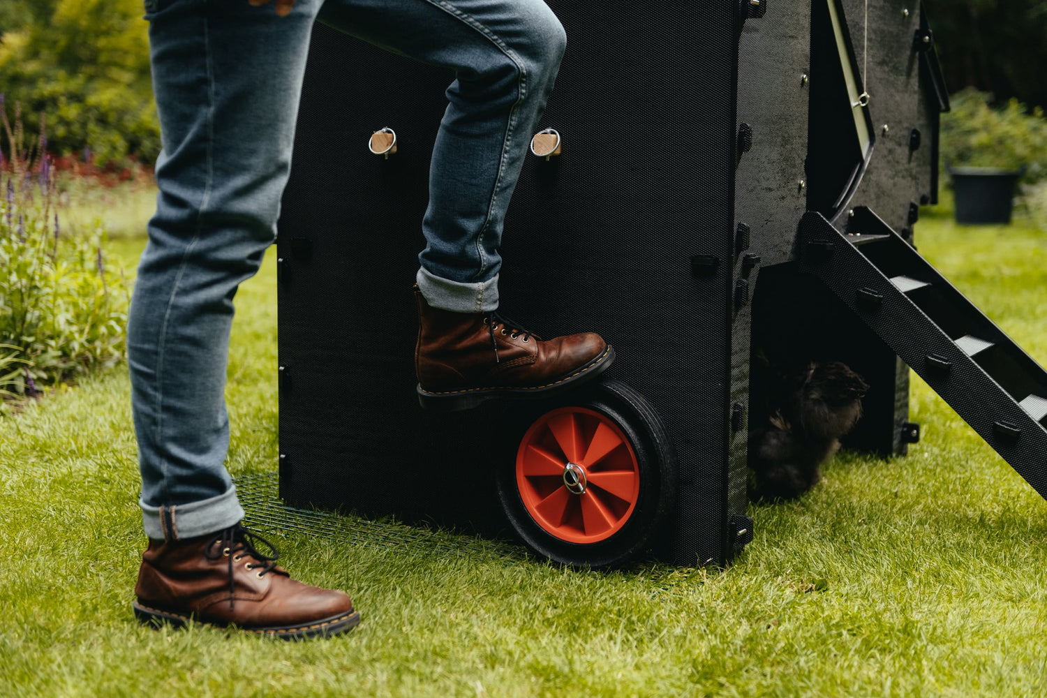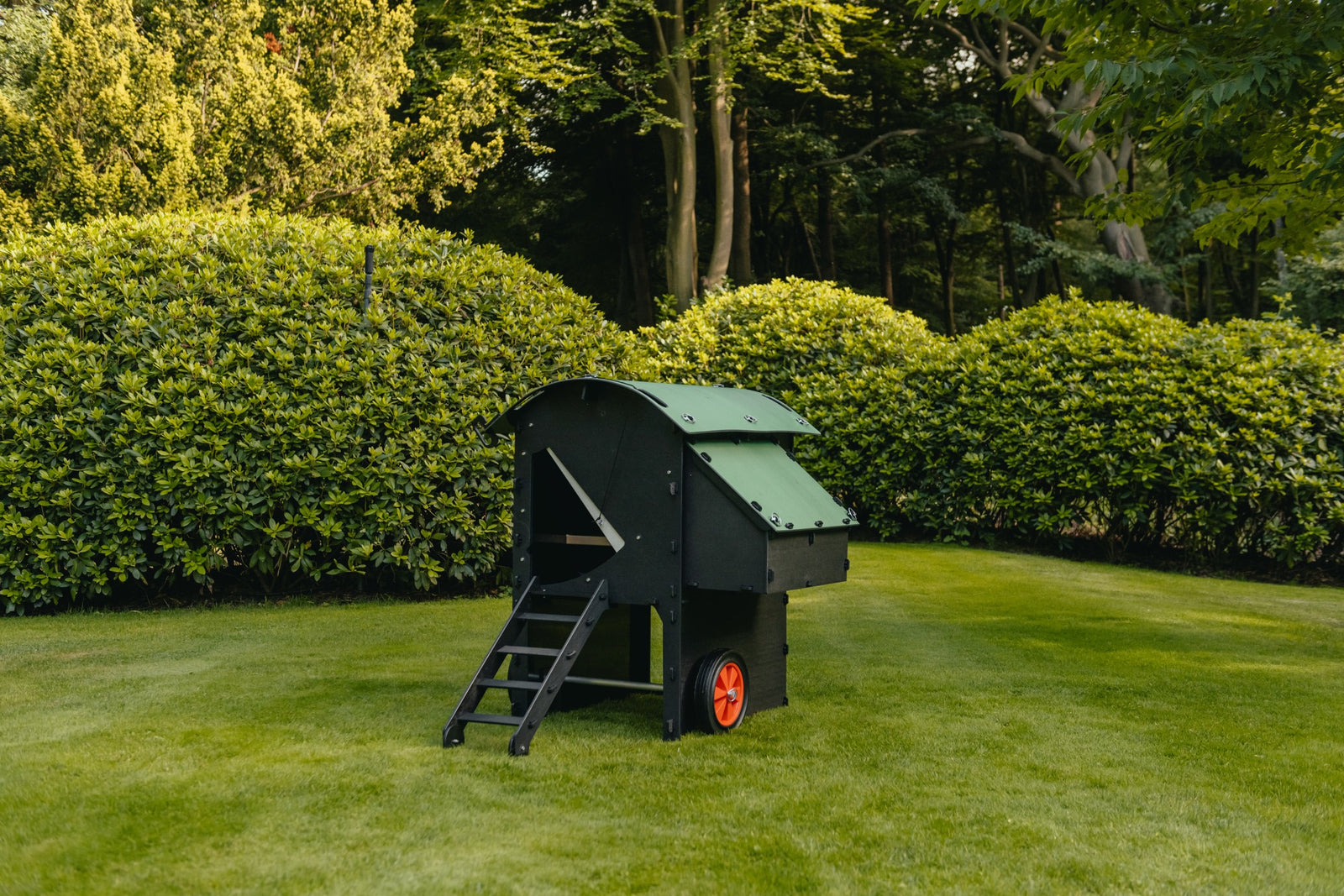 Mit den Schnellverschlussclips können Sie das Radsatz in Sekundenschnelle anbringen oder entfernen, und zwei vorgestanzte Schlitze im Boden des erhöhten Hühnerstalls sorgen für eine entkoppelte Ruheposition.